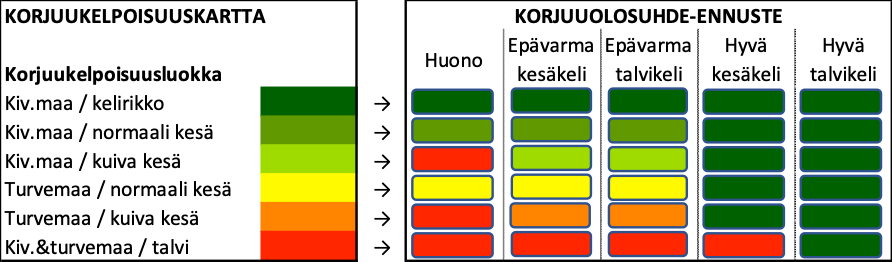 Jokaisen päivän kartalla ennustetut indexit vaihtavat korjuukelpoisuus luokitusta hyväksi tai huonoksi. Hyvät talviolosuhteet sallivat korjuun kaikialla, hyvät kuivat kesätilanteet sallivat korjuun muualla kuin talviluokissa. Huonoja olosuhteita esitetään kuivuutta tai talviolosuhteita edellyttävissä paikoissa, jos olosuhteita ei ennusteta. Vuodenaikaisennusteet eivät ole luotettavia kuten sääennusteet, siksi on myös tilanteita, joissa emme tohdi ennustaa olosuhteita.
