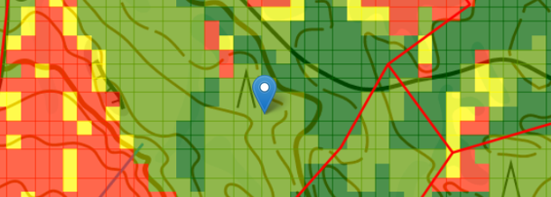 Zoomaa takaisin lähelle sinistä osoitinmerkkiä. Leimikkotasolla näkyvässä perustilanteessa on esillä perinteisen korjuukelpoisuuskartan esittämä tieto alueen korjuukelpoisuudesta.