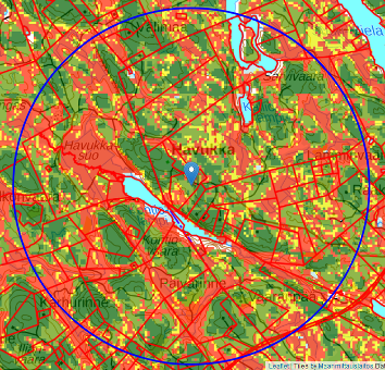 Laskelma tehdään sinisen ympyrän alueen sää- ja ilmastotietojen perusteella (zoomaa leimikkotasolta kauemmaksi, jotta näet sinisen ympyrän.)