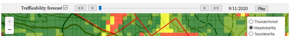 Kun laitat ruksin Trafficability forecast -kohtaan kartan ylälaidassa, Play-toiminto aktivoituu ja voit tarkastella karttaruudun aikajanalla kelaten korjuukelpoisuusarviota eteenpäin seuraavalle kuudelle kuukaudelle sää- ja ilmasto-olosuhteet huomioiden. Voit ohjata kartan päivämäärää myös liukukytkimellä sekä eteen- ja taaksepäin painikkeilla.