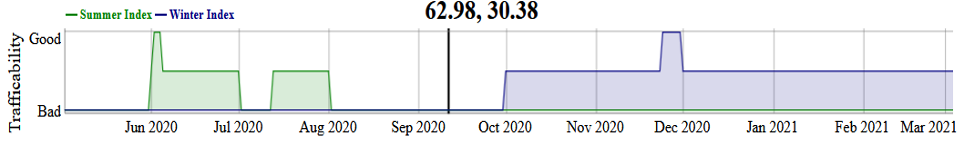 Kartan yläpuolella kuvaajassa on kaksi indeksiä (Summer Index ja Winter Index), jotka kuvaavat kohteen korjuukelpoisuutta kesä- ja talvitilanteiden kannalta asteikolla hyvä, epävarma (keskellä asteikkoa) ja huono.